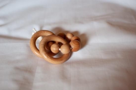 振るとカタカタ鳴るウッドビーズの優しい音色にママも赤ちゃんも笑顔に。