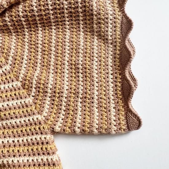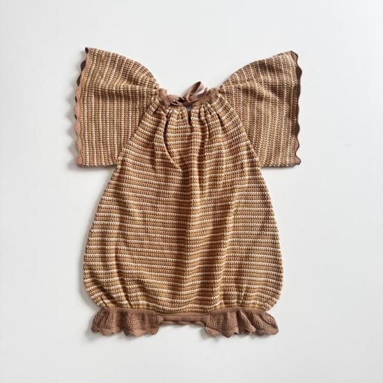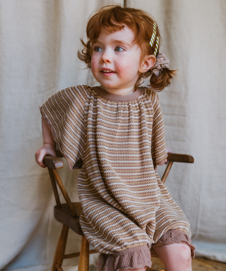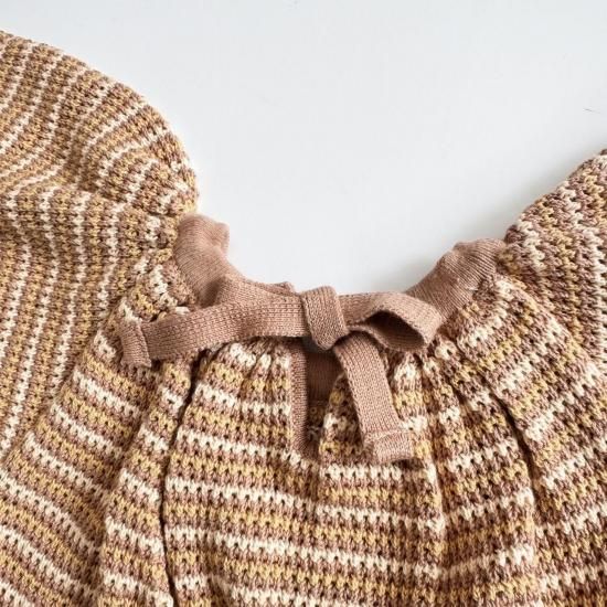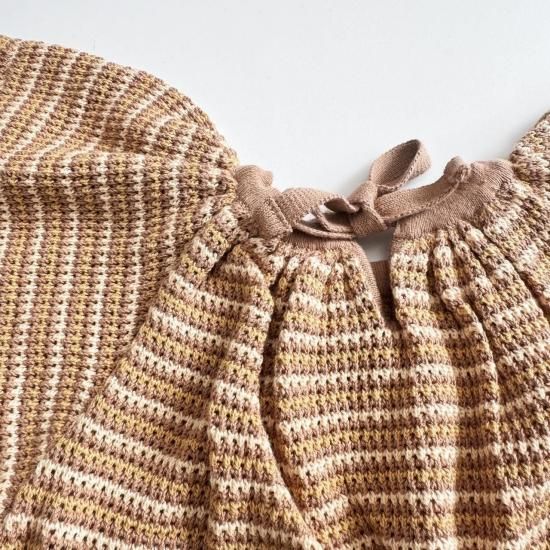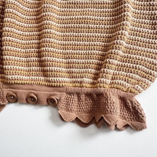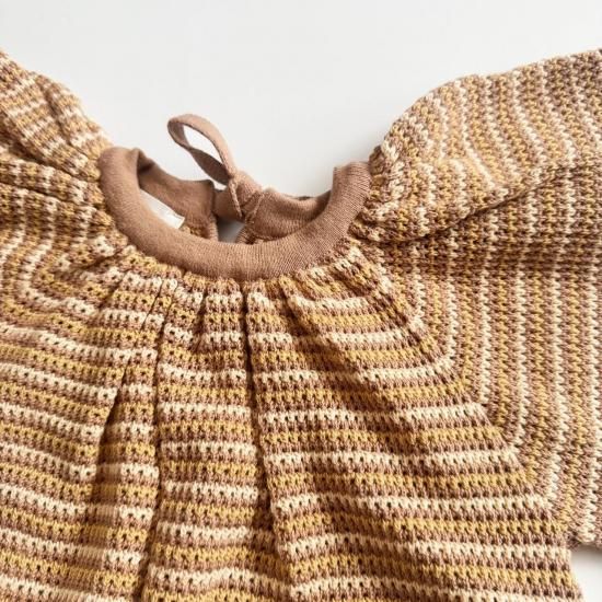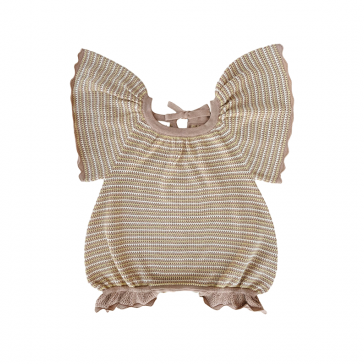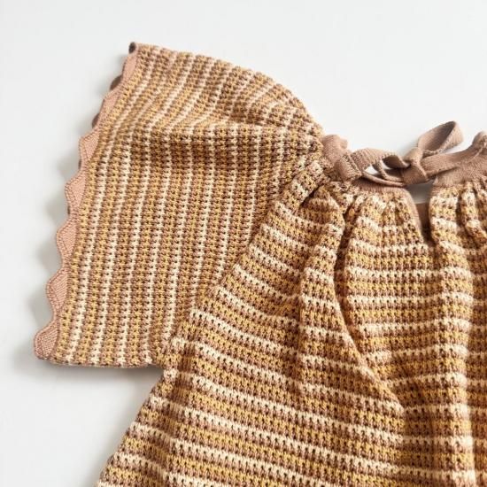 バタフライスリーブのボーダー編みのショート丈ロンパース。