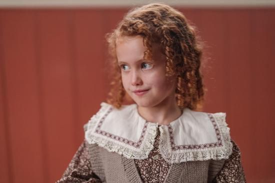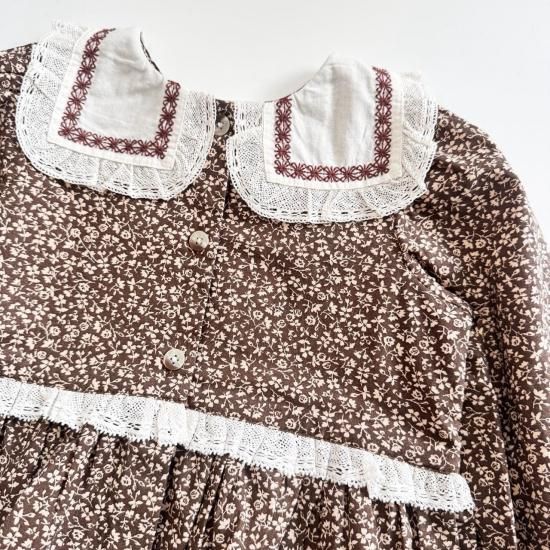 オフホワイトのセーラーカラーには、コントラストの効いた刺繍とギャザーレースのトリムが施されています。