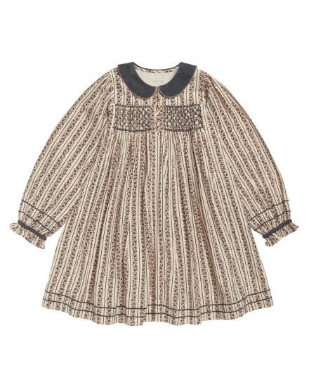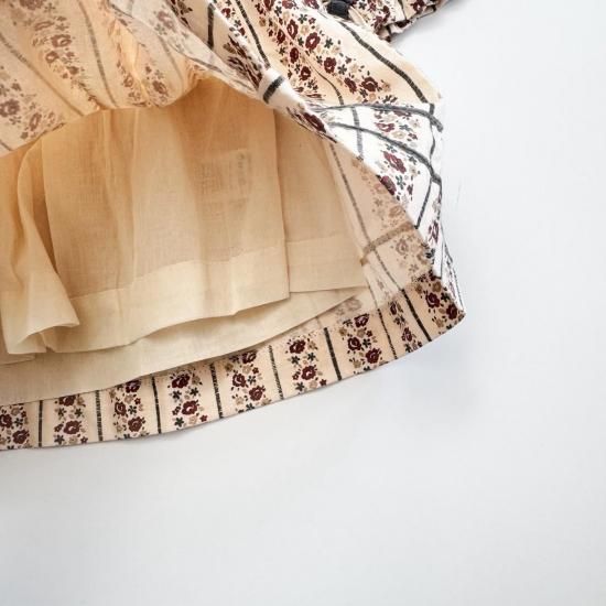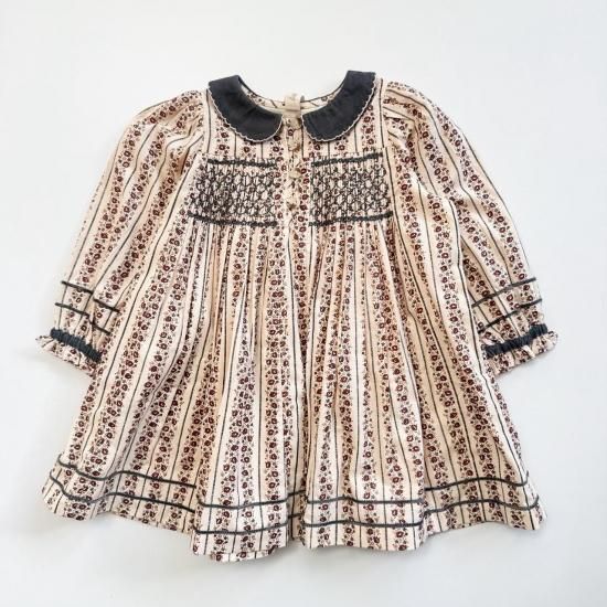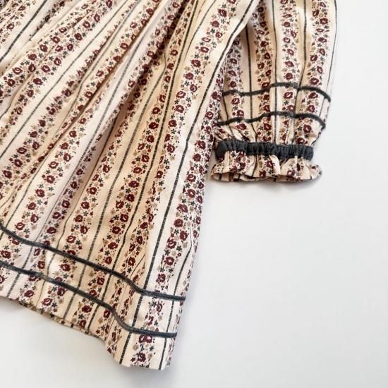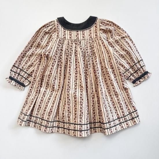 衿にはフリル仕上げの袖口、コットンベルベットのピーターパンカラーに綿のトリムステッチ、袖と裾にはベルベットリボンが施されています。
