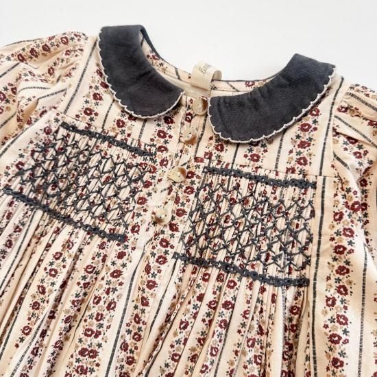 前身頃のボタンプラケットにはボタンとループが施され、その両側には美しいハンドスモッキングパネルが施されています。