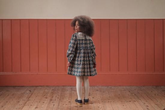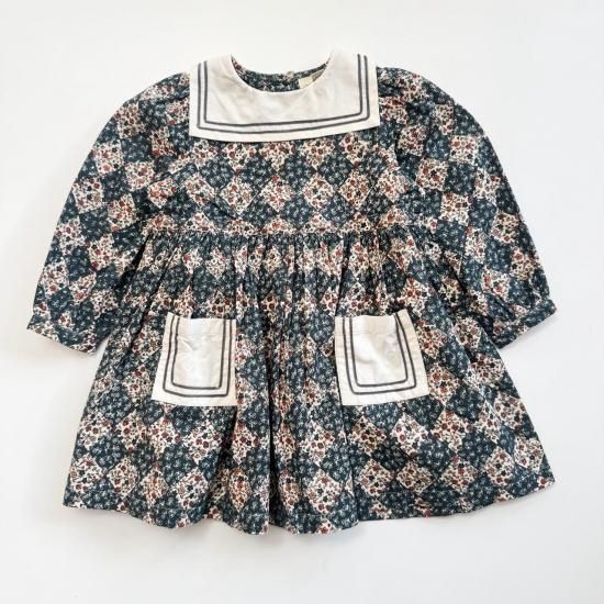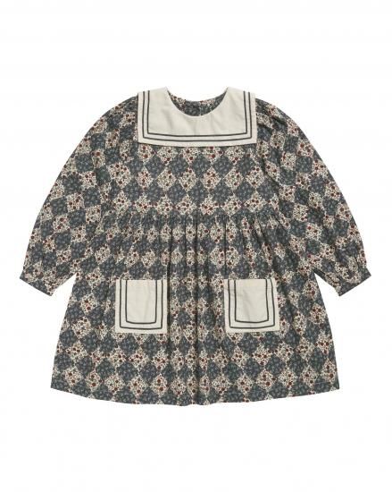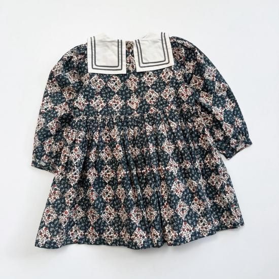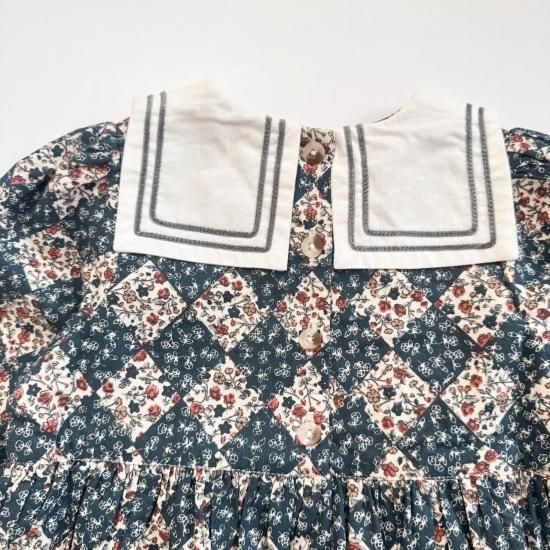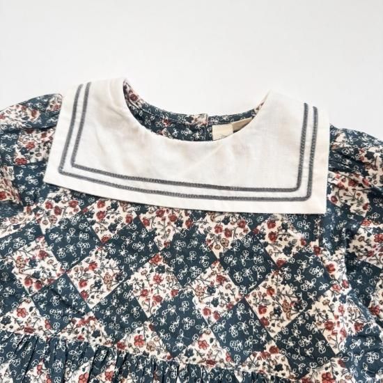 コントラストのある白いセーラーカラーには、ベルベットリボンのダブルローが施されており、袖はきちんとしたボタン付きカフスで仕上げられています。