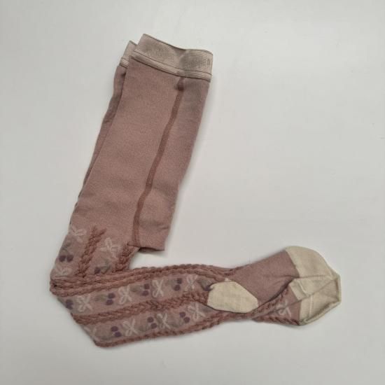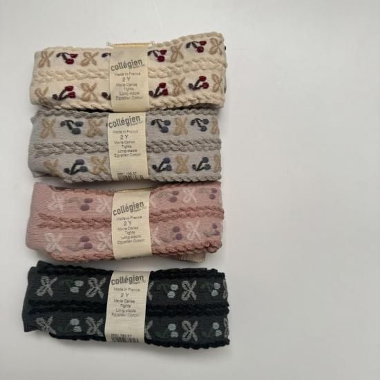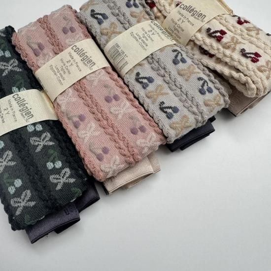 Ceriseのタイツは、スタイリッシュなデザインと柔らかさを兼ね備え、魅力的なチェリーとリボンの模様が特徴です。